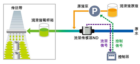 流量传感器与泵、控制器组合使用,可为生产线提供稀释后的润滑液※。